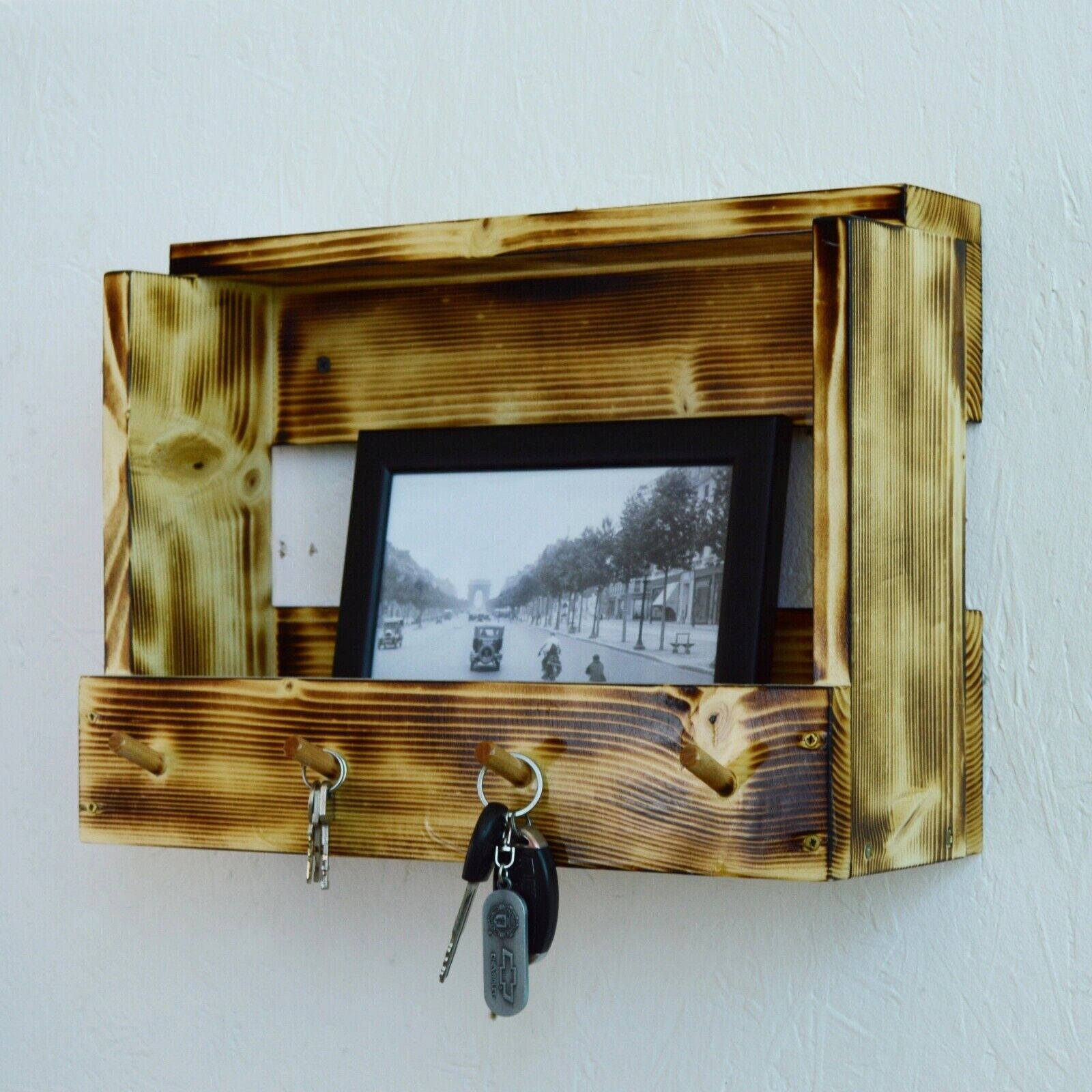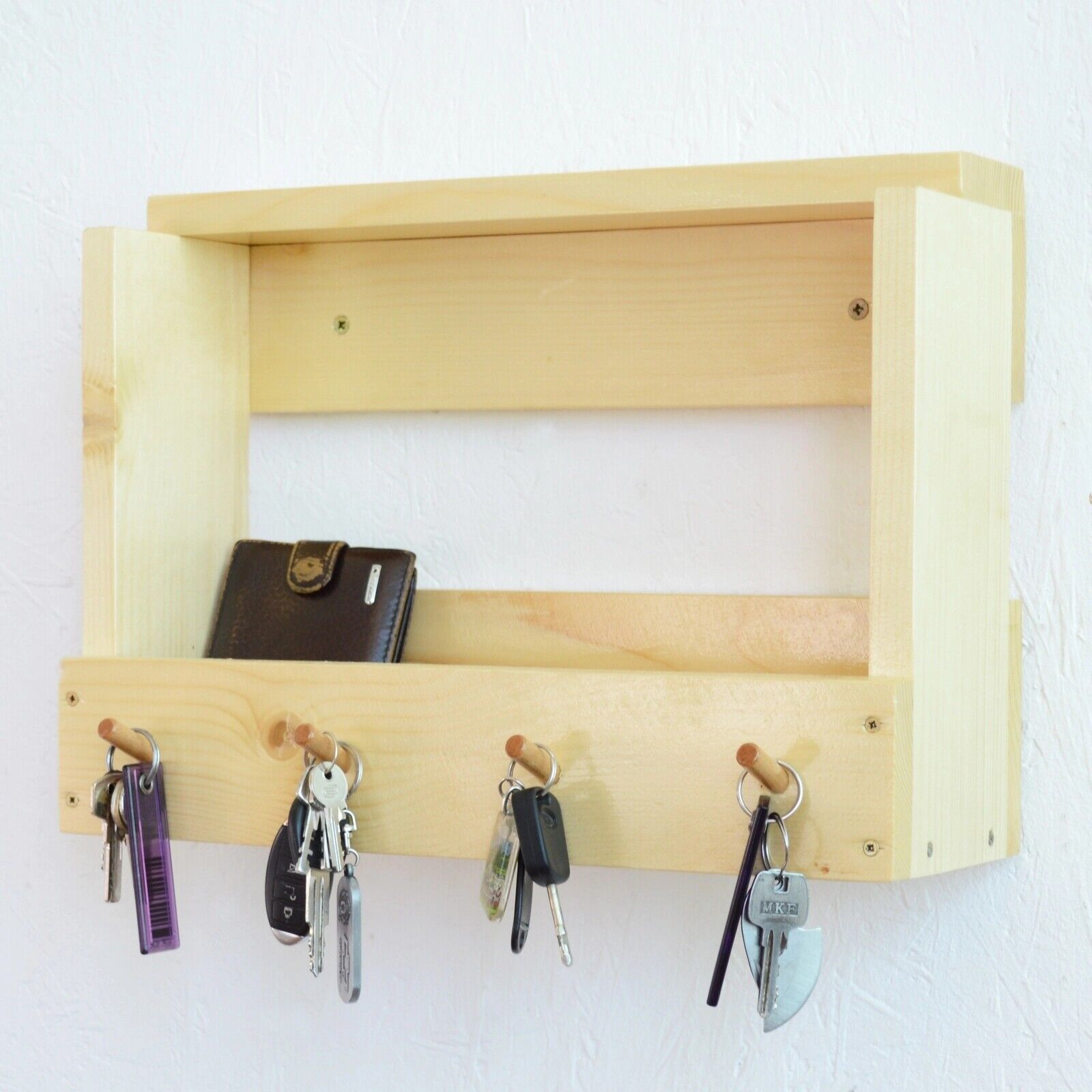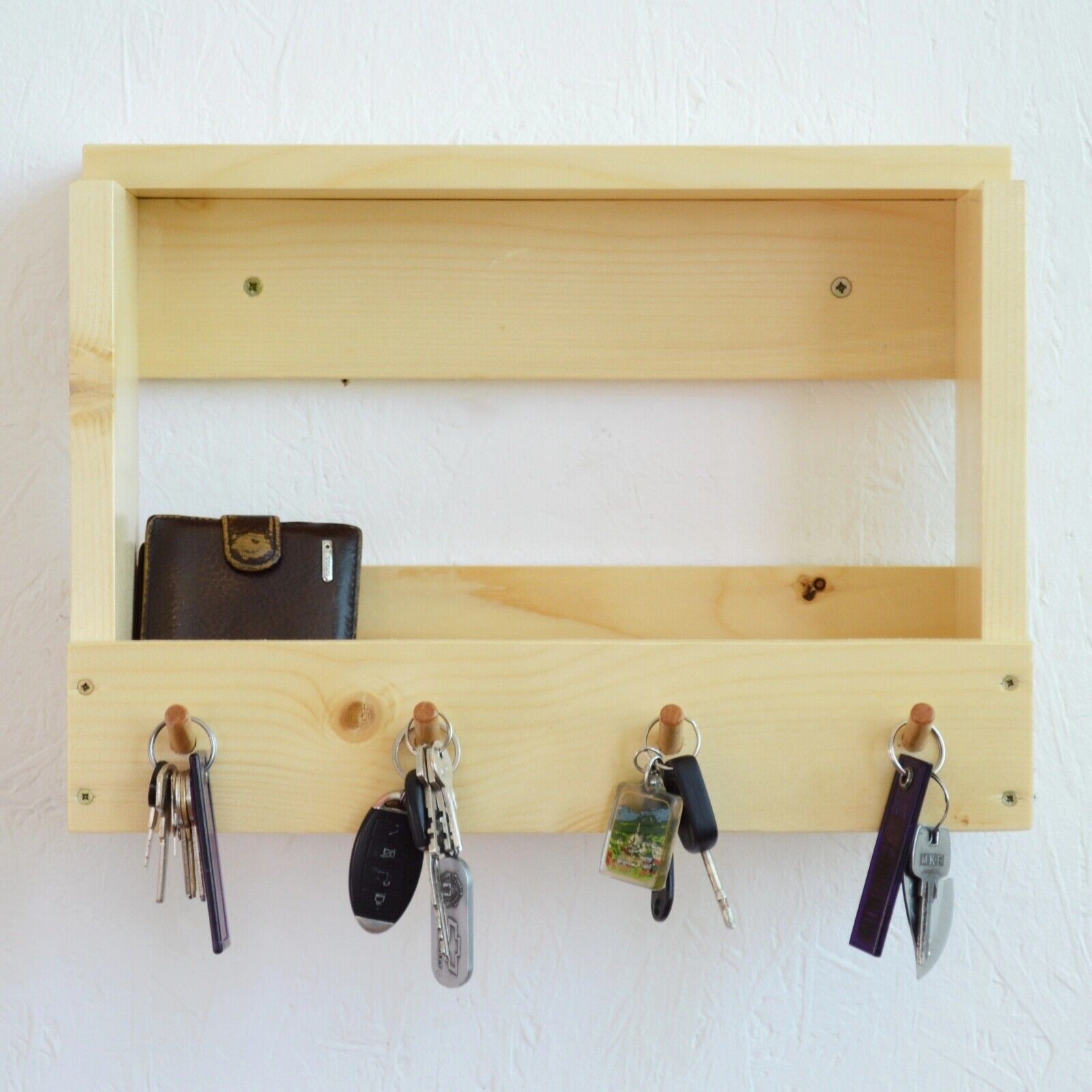 Spend a lot of time looking for the keys before you leave the house? With this holder, you will no longer need to do this. When you get home, you can hang the keys on one of the 4 hooks to easily find them on departure. The support is made of wood, is easily mounted on the wall, and takes up little space. In addition to the key hooks, the holder also has a space for storing your wallet, gloves, photos, or others.