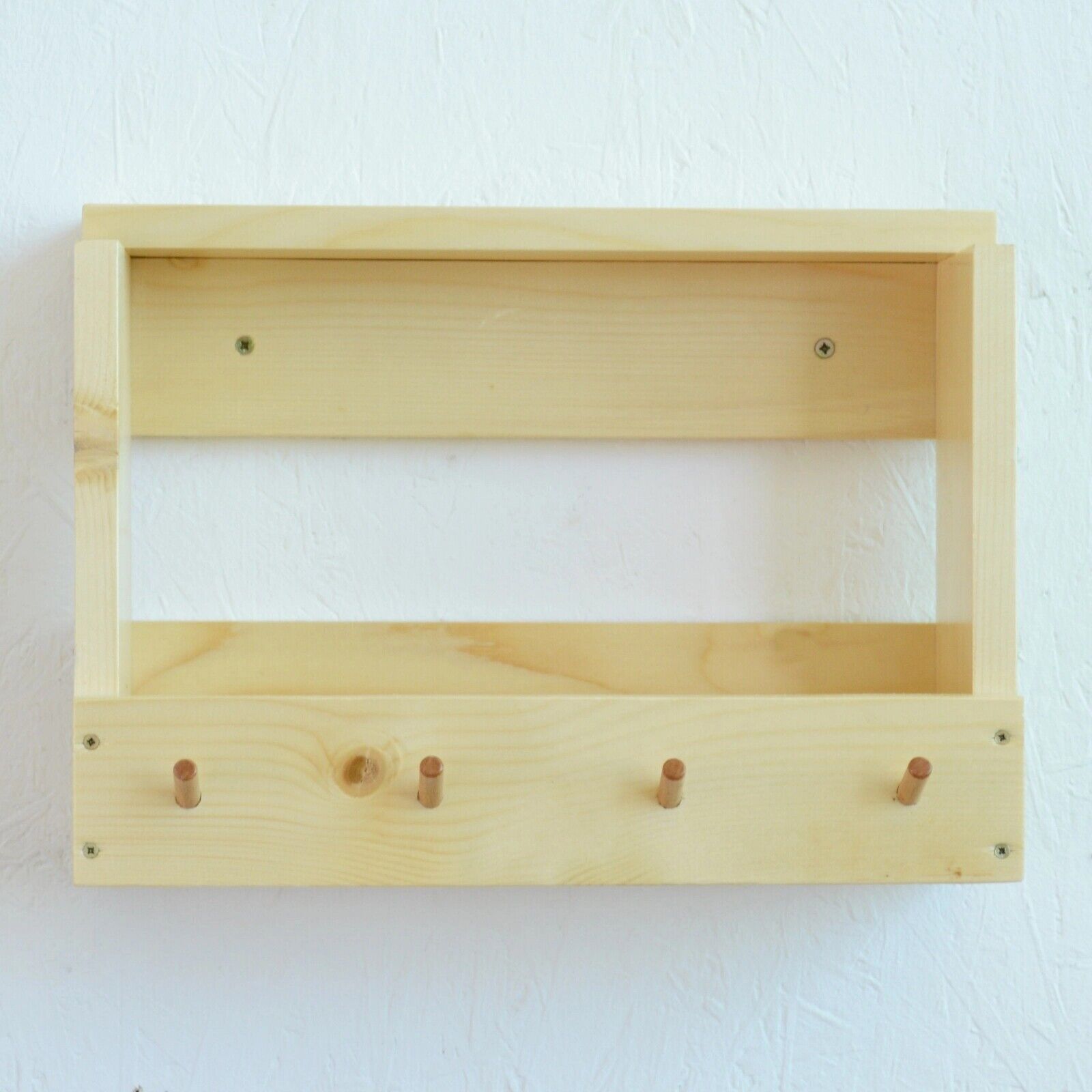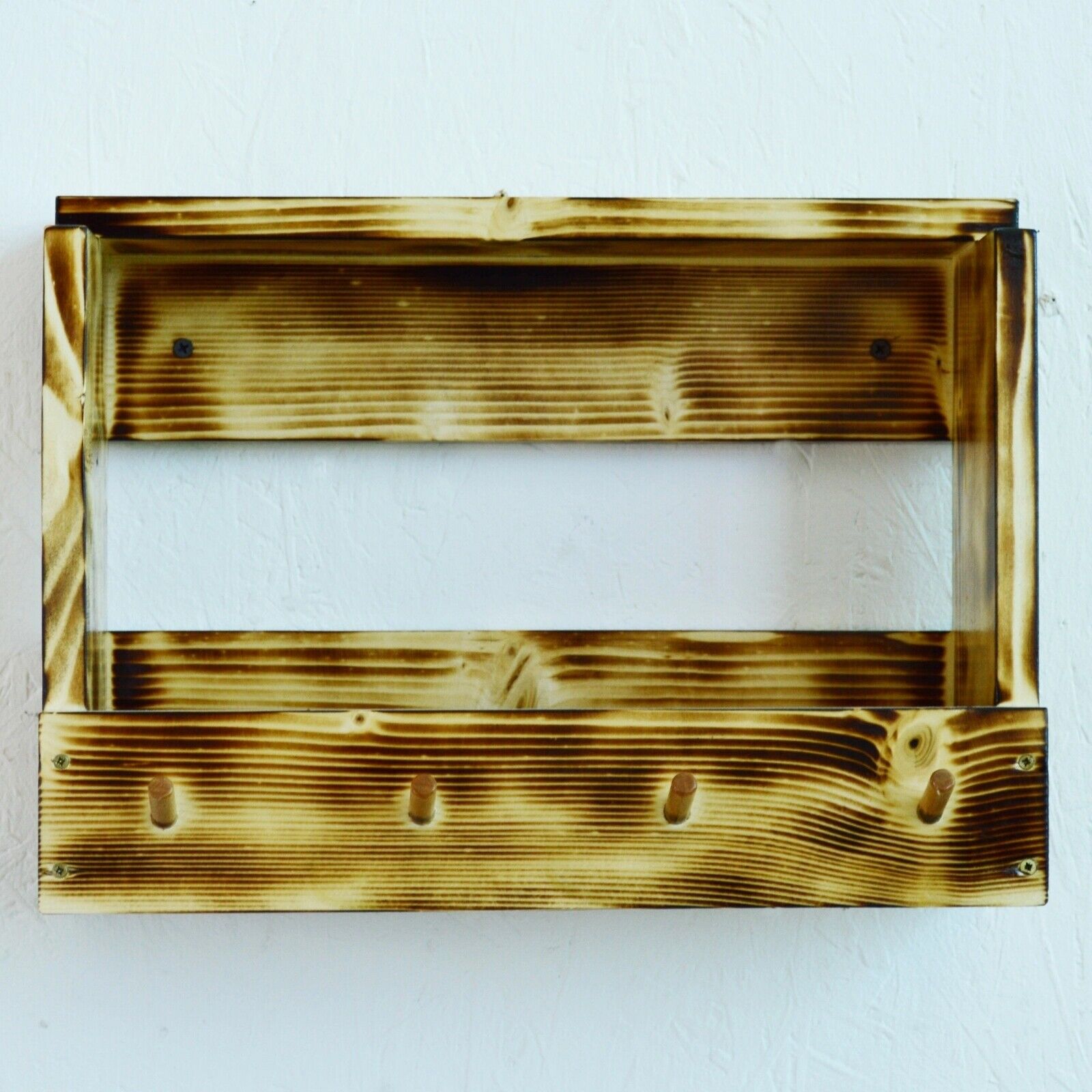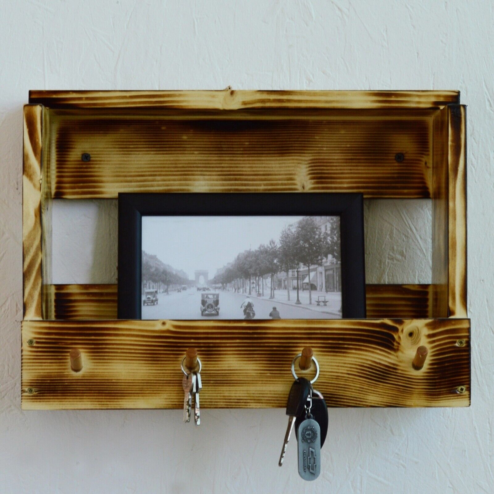 Spend a lot of time looking for the keys before you leave the house? With this holder, you will no longer need to do this. When you get home, you can hang the keys on one of the 4 hooks to easily find them on departure. The support is made of wood, is easily mounted on the wall, and takes up little space. In addition to the key hooks, the holder also has a space for storing your wallet, gloves, photos, or others.